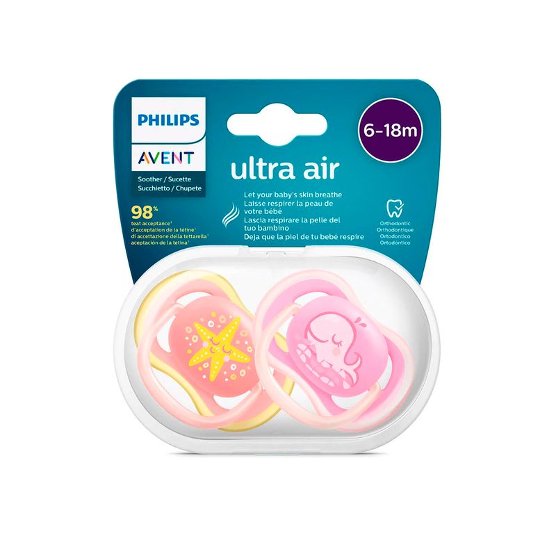 Pack de 2 chupetes Philips Avent Ultra Air para 6–18 meses, con orificios extragrandes que favorecen la ventilación de la piel y escudo ligero; libres de BPA. (philips.es)