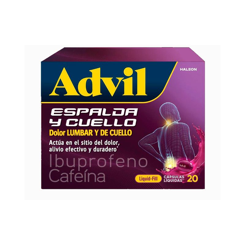 Cápsulas líquidas con ibuprofeno y cafeína para el alivio del dolor de espalda y cuello; dirigidas a adultos; tomar según indicaciones del empaque; presentación caja por 20 cápsulas.