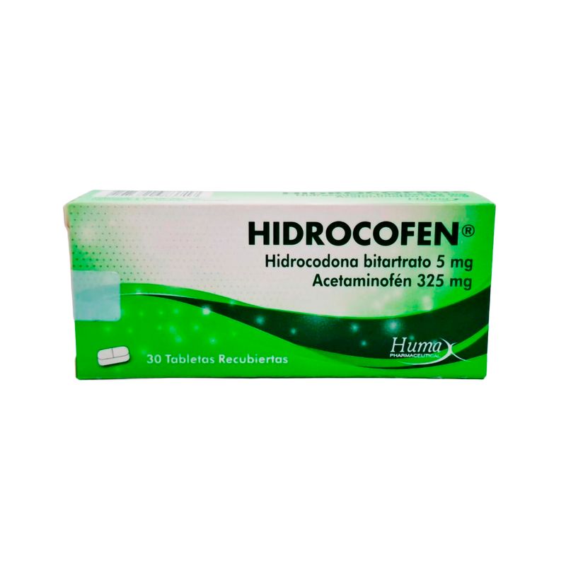 Tabletas de acetaminofén 325 mg e hidrocodona 5 mg para manejo del dolor, de venta bajo prescripción; vía oral según indicación médica; presentación caja por 30 tabletas.