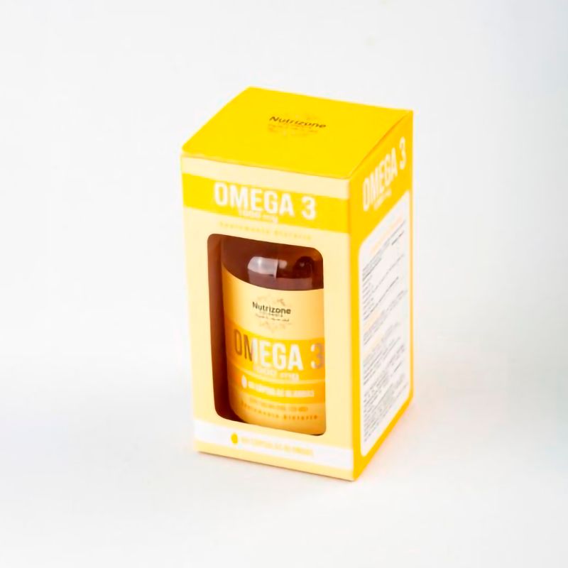 Suplemento de aceite de pescado con ácidos grasos omega-3 en cápsulas blandas; frasco con 60 unidades para consumo oral.