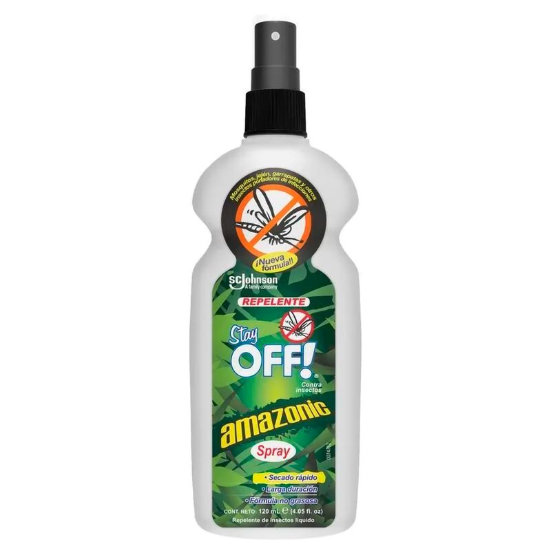 Repelente de insectos Stay OFF! Amazonic Spray 120 ml. larga duración, Ingrediente activo DEET al 25% ,uno de los ingredientes activos más comunes y usados en el mundo contra insectos que pueden transmitir enfermedades como Zika, Dengue y chikungunya. Ideal para actividades al aire libre, senderismo, caminatas. De fácil aplicación y secado rápido.